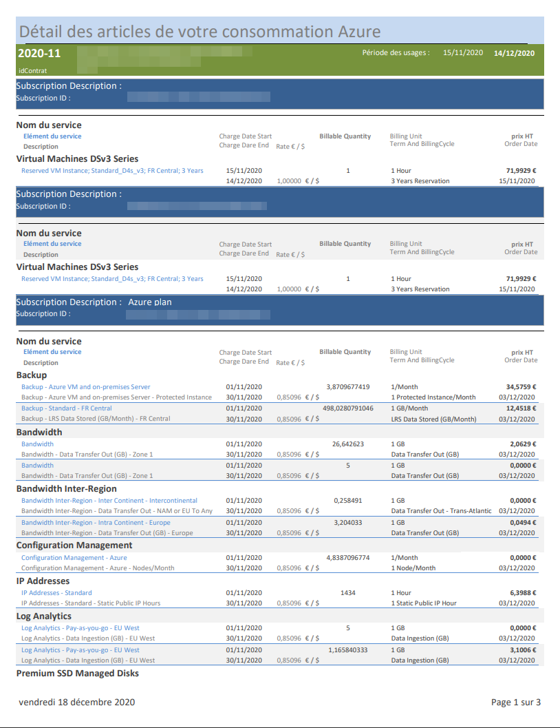 Cet article vous présente les différentes rubriques apparaissant dans votre facture détaillée de consommation Azure.